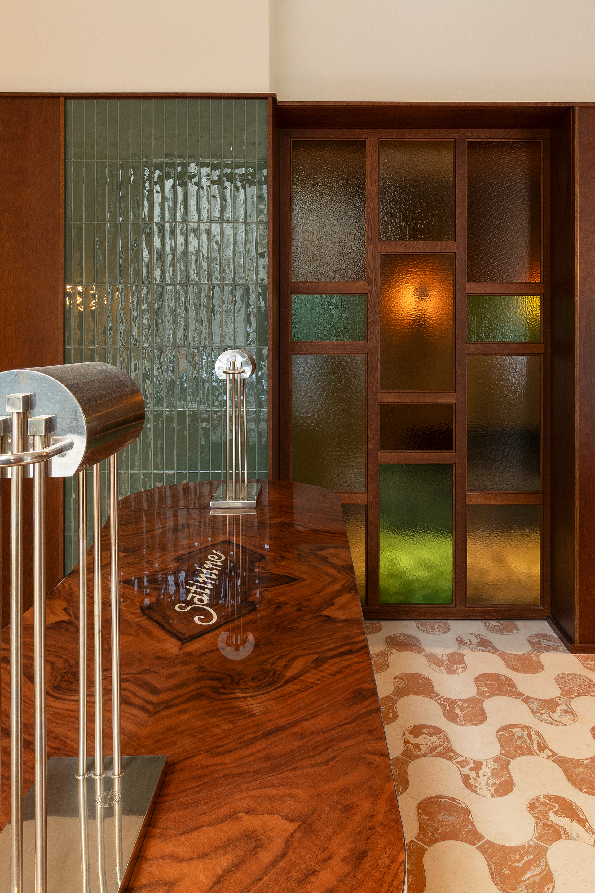 The interiors of the Satinine space combine design rigor and the excellence of local manufacturing. The project was developed through close collaboration with local artisans and producers, with particular attention to the quality of materials and the local supply chain. The connection with the memory of Milan is tangible in every detail: the Lombard terracotta floor, laid according to traditional techniques, anchors the space to its origin; the glossy ceramic tiles, arranged vertically, pay homage to the typical textures of Milanese apartment buildings; the cathedral glass partitions evoke the discreet luminosity of doors overlooking entrance halls.